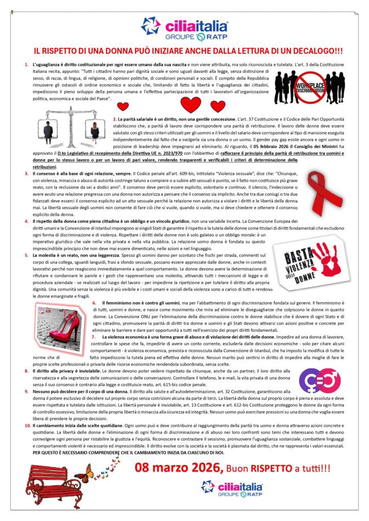 - Un decalogo per sottolineare le prime 10 regole auree da cui inizia il rispetto per la madre, la figlia, la moglie, la dipendente, la collega, l’amica. Un promemoria promosso, pubblicato, affisso negli spazi aziendali perché anche una semplice lettura stimola la riflessione e pungola la coscienza sociale.